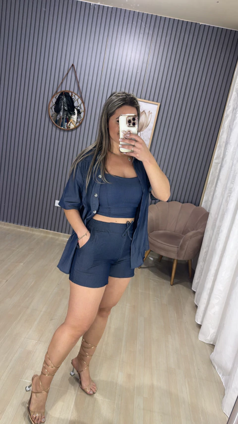 Conjunto 3 Peças em Chambray – Shorts, Cropped e Camisa Alongada